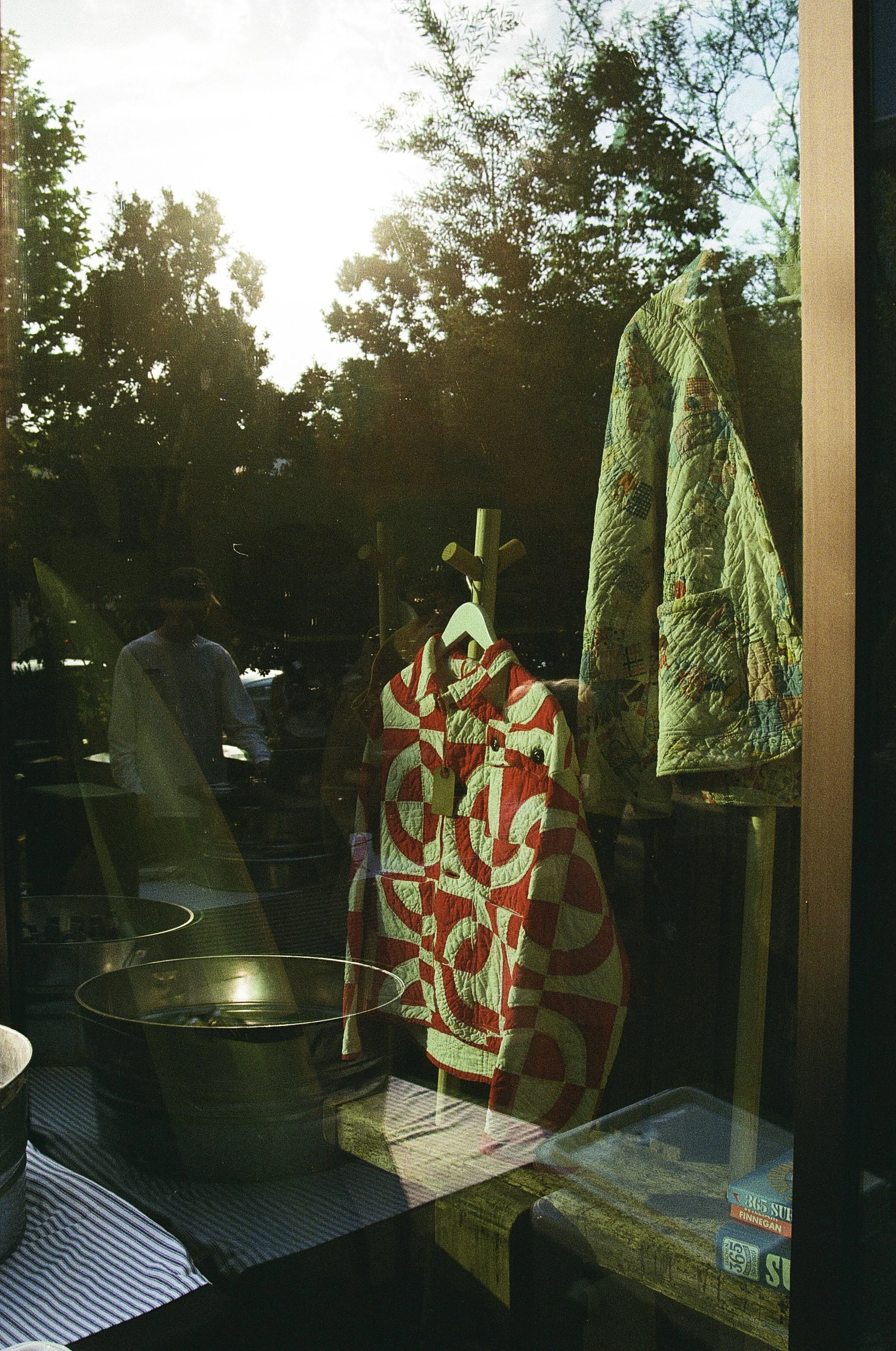 Reflective view of a store window displaying two quilted jackets, one red and white and the other green with colorful patterns, with trees and people outside