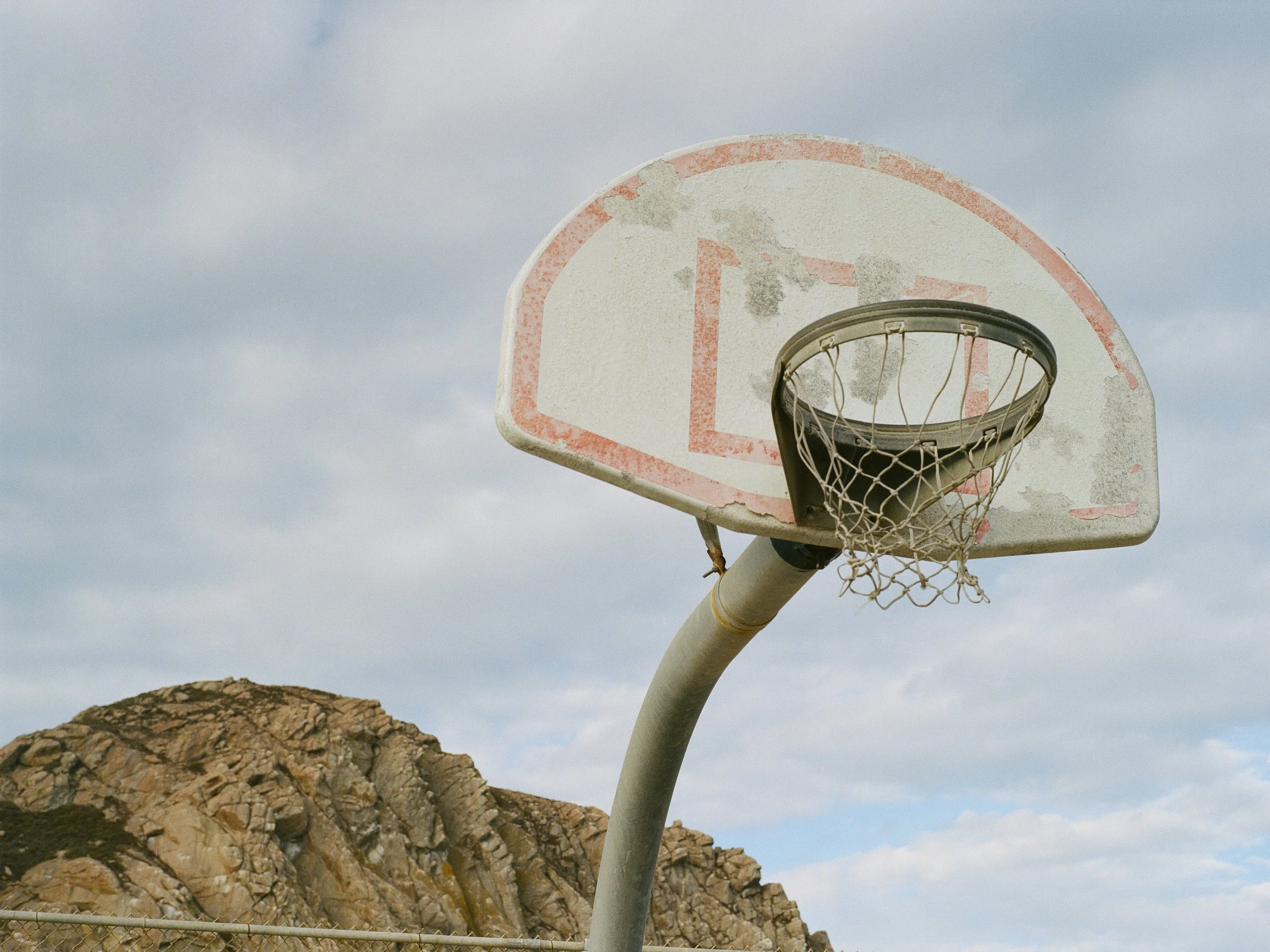 Old, worn basketball hoop on a cloudy day with rocky hills in the background.