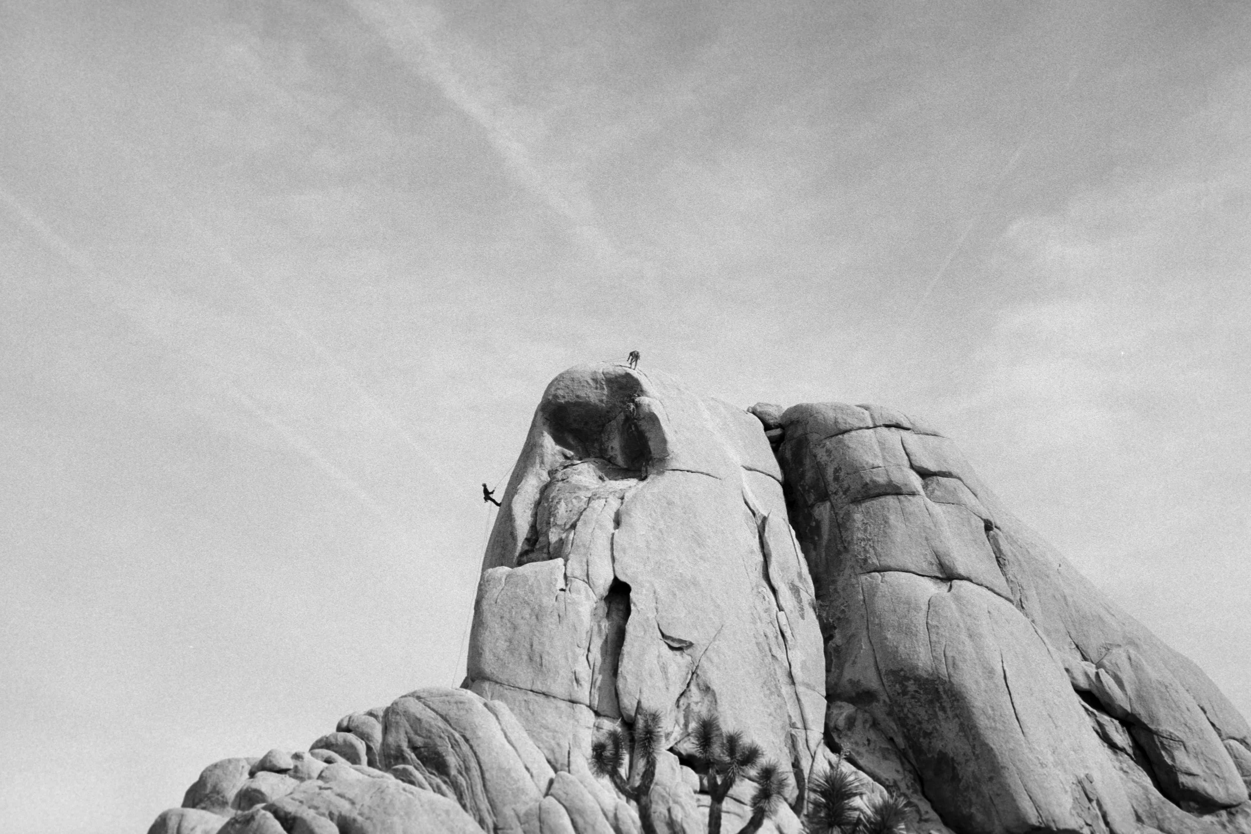 People rock climbing on a large granite formation with a Joshua tree in the foreground, under a partly cloudy sky. View fullsize