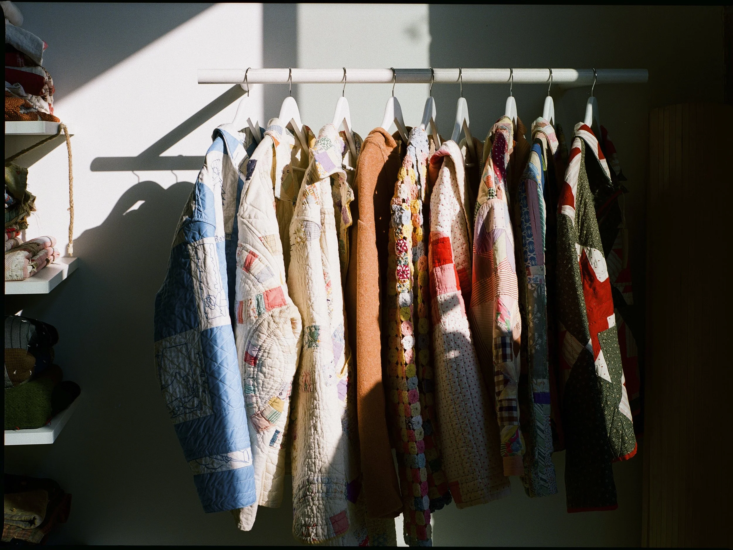 A clothing rack with colorful quilted and patterned jackets hanging on white hangers, lit by sunlight, with shadows cast on the wall behind. View fullsize