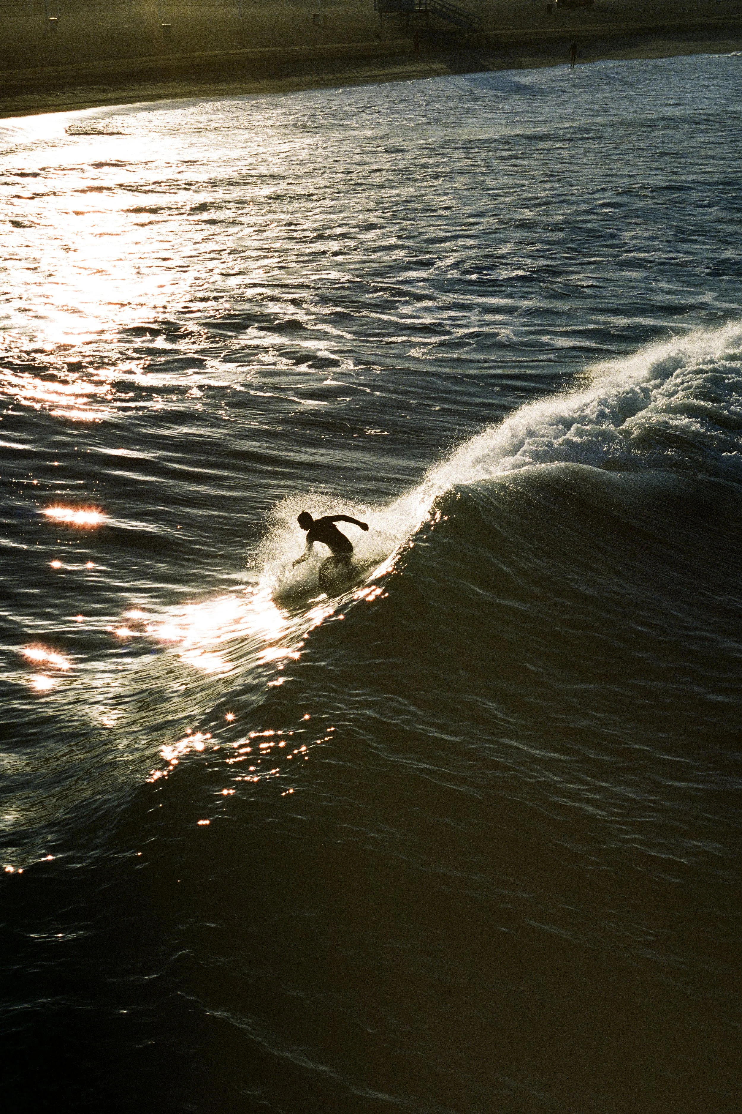 A surfer riding a wave at the beach during sunset with a sandy shoreline in the background. View fullsize