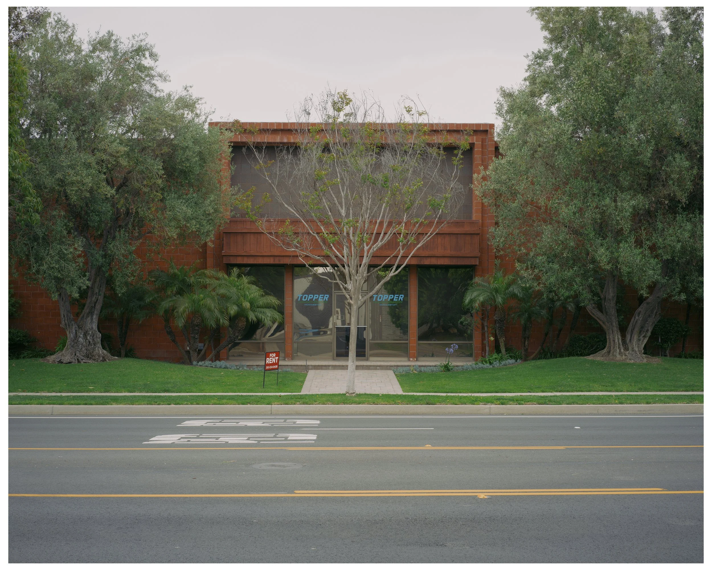 A two-story red brick building with large glass windows and doors, trees and shrubs in front, and a "For Rent" sign near the entrance, adjacent to a road with yellow lane markings. View fullsize